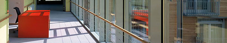 Die Wohngruppen in den einzelnen Baukörpern sind in kühleren, jedoch sanften pastelligen Farbtönen sehr zurückhaltend gestaltet und lassen viel Spielraum für persönliche Möblierung und Dekoration. Hauptfarbträger sind hier Bodenbeläge und farblich harmonierende Türblätter, Vorhänge und Gardinen. Zarte Blau-Violett-Töne wurden nur im privaten Bereich eingesetzt. In den Dusch- und Wohlfühlbädern erinnert die Farbe Blau an Wasser, Frische und Weite.
