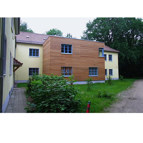 Der Anbau wurde als ein vom Hauptgebäude abgesetzter, moderner Baukörper mit einer sehr prägnanten Holzfassade (unbehandelte Lerche) geplant. Einerseits sollte sich die Architektur deutlich vom Bestandsgebäude absetzen, andererseits bot sich durch den Neubau die Chance, das Umfeld, die Parkanlage, zu würdigen und widerzuspiegeln.