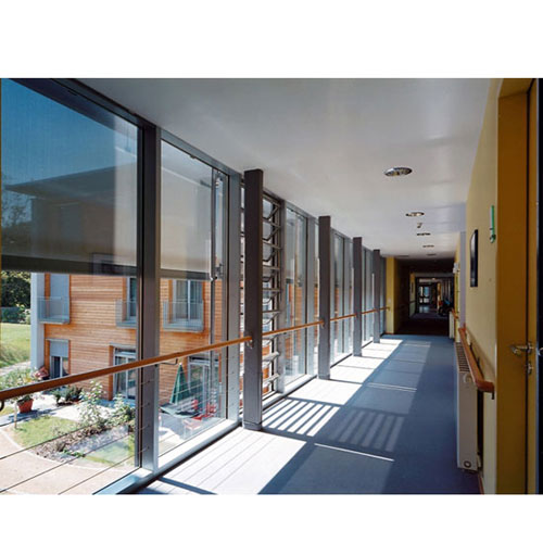 Die Wohngruppen in den einzelnen Baukörpern sind in kühleren, jedoch sanften pastelligen Farbtönen sehr zurückhaltend gestaltet und lassen viel Spielraum für persönliche Möblierung und Dekoration. Hauptfarbträger sind hier Bodenbeläge und farblich harmonierende Türblätter, Vorhänge und Gardinen. Zarte Blau-Violett-Töne wurden nur im privaten Bereich eingesetzt. In den Dusch- und Wohlfühlbädern erinnert die Farbe Blau an Wasser, Frische und Weite.