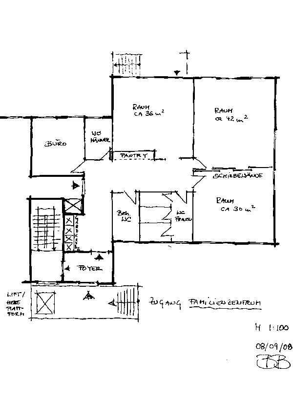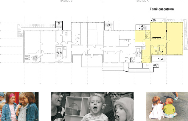 Ein Teil im Untergeschoss des Kindergartens Volkmarsdorf (siehe dort) wurde zu einem behindertengerechten Familienzentrum ausgestaltet. Unser Entwurf schuf auf kleinstem Raum mit geringem Umbau alle notwendigen Räume und Anforderungen.
